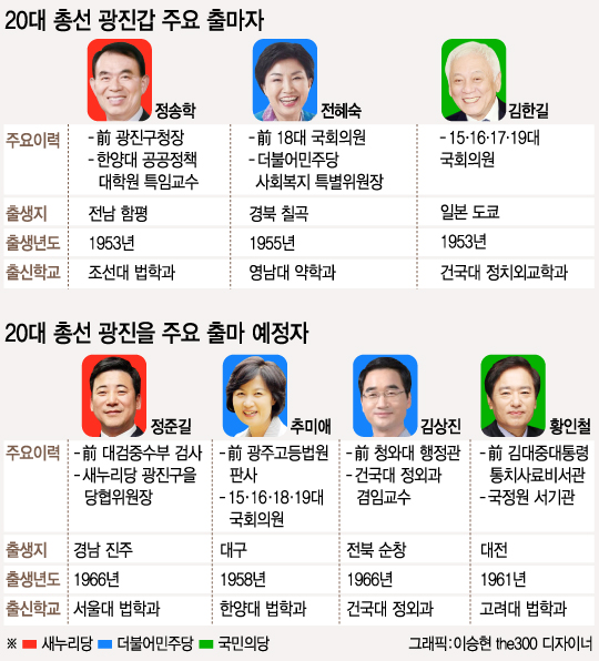 19´ë Çö¿ª ÀÇ¿øµéµµ ±¤Áø°©Àº ±èÇÑ±æ ±¹¹ÎÀÇ´ç ÀÇ¿ø, ±¤ÁøÀ»Àº Ãß¹Ì¾Ö ´õºÒ¾î¹ÎÁÖ´ç ÀÇ¿øÀÌ´Ù. À̸§¸¸ µé¾îµµ ´ëºÎºÐÀÌ ¾Æ´Â Àü±¹±¸ Á¤Ä¡Àεé·Î À̹ø 20´ë ÃѼ±¿¡¼ ¶Ç ÇÑ ¹ø ¼ö¼º¿¡ ³ª¼°í ÀÖ´Ù.